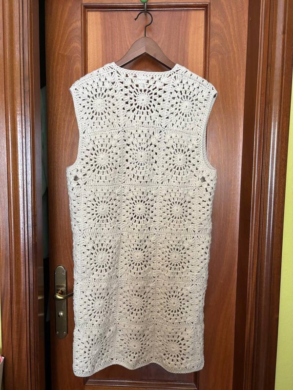 - Chaleco largo, tejido a mano, a crochet, de algodón y acrílico.