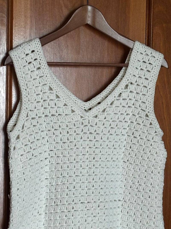 - Suéter, tejido a mano, a crochet, de algodón y acrílico.